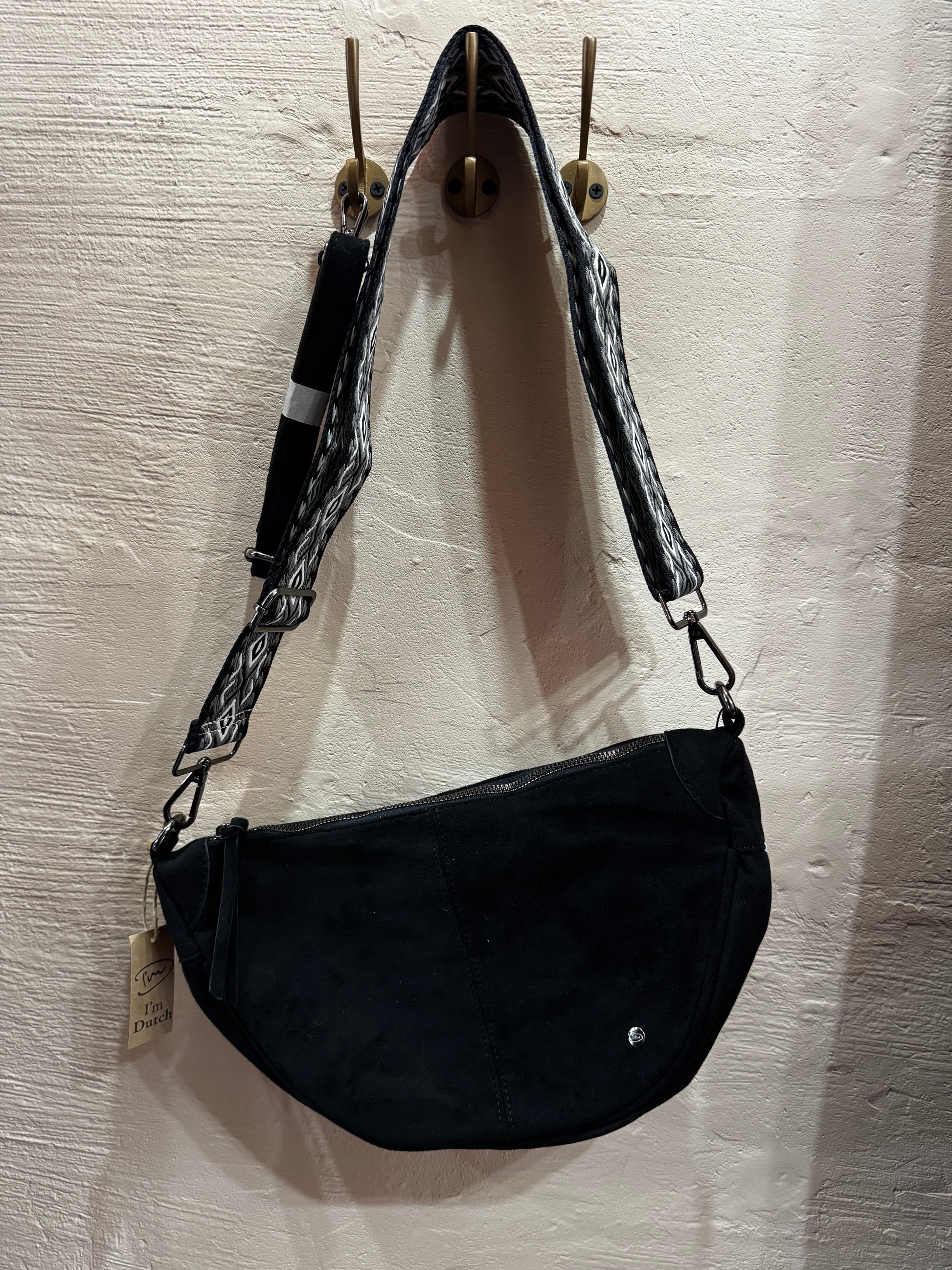 Deze stijlvolle handtas in suède look is de perfecte mix van mode en functionaliteit. Met haar halfronde vorm en stoere look past ze moeiteloos bij iedere outfit, van casual tot chic. De tas is verkrijgbaar in verschillende kleuren en komt met een basic riem en leuke verstelbare bagstrap.