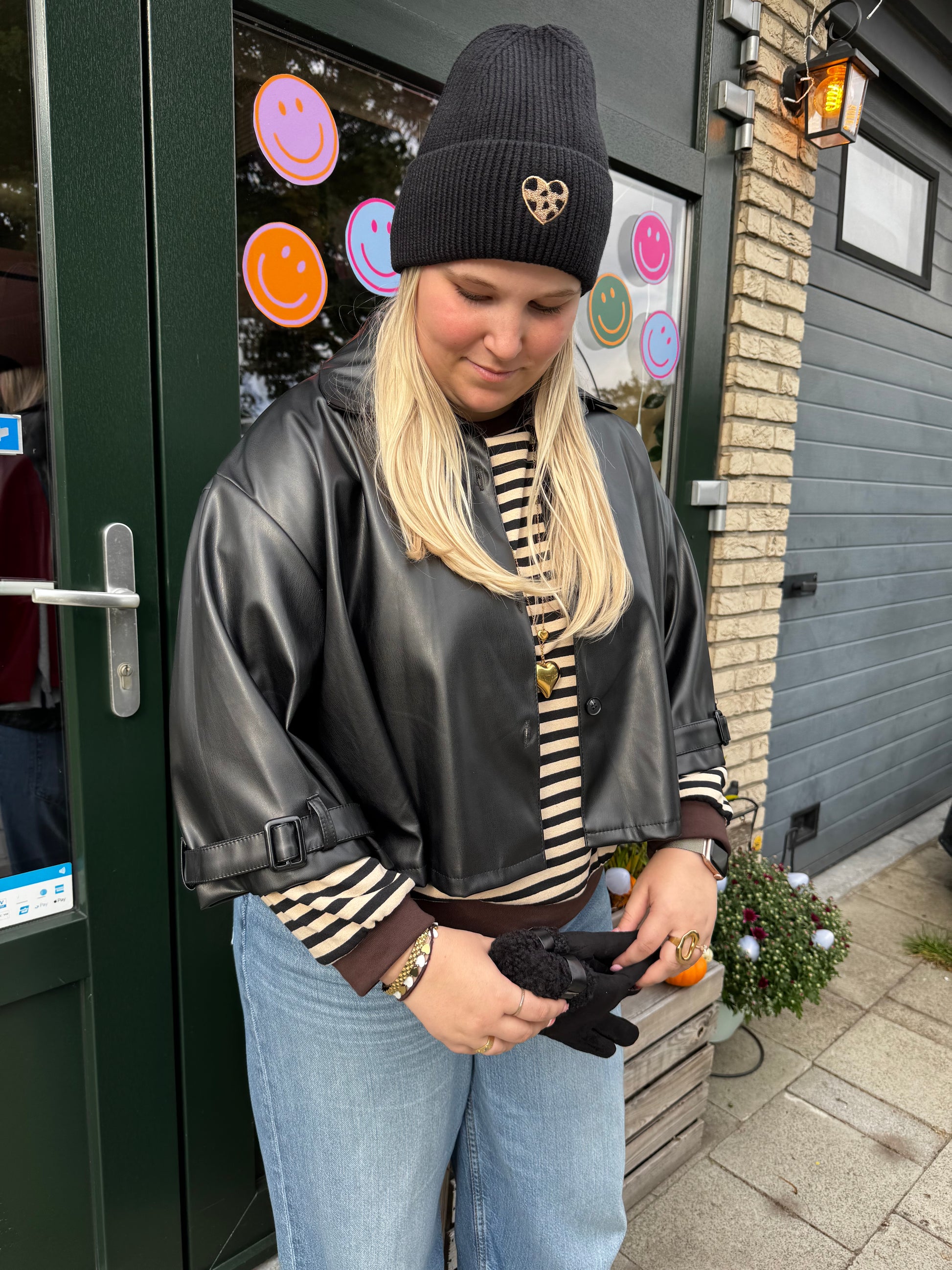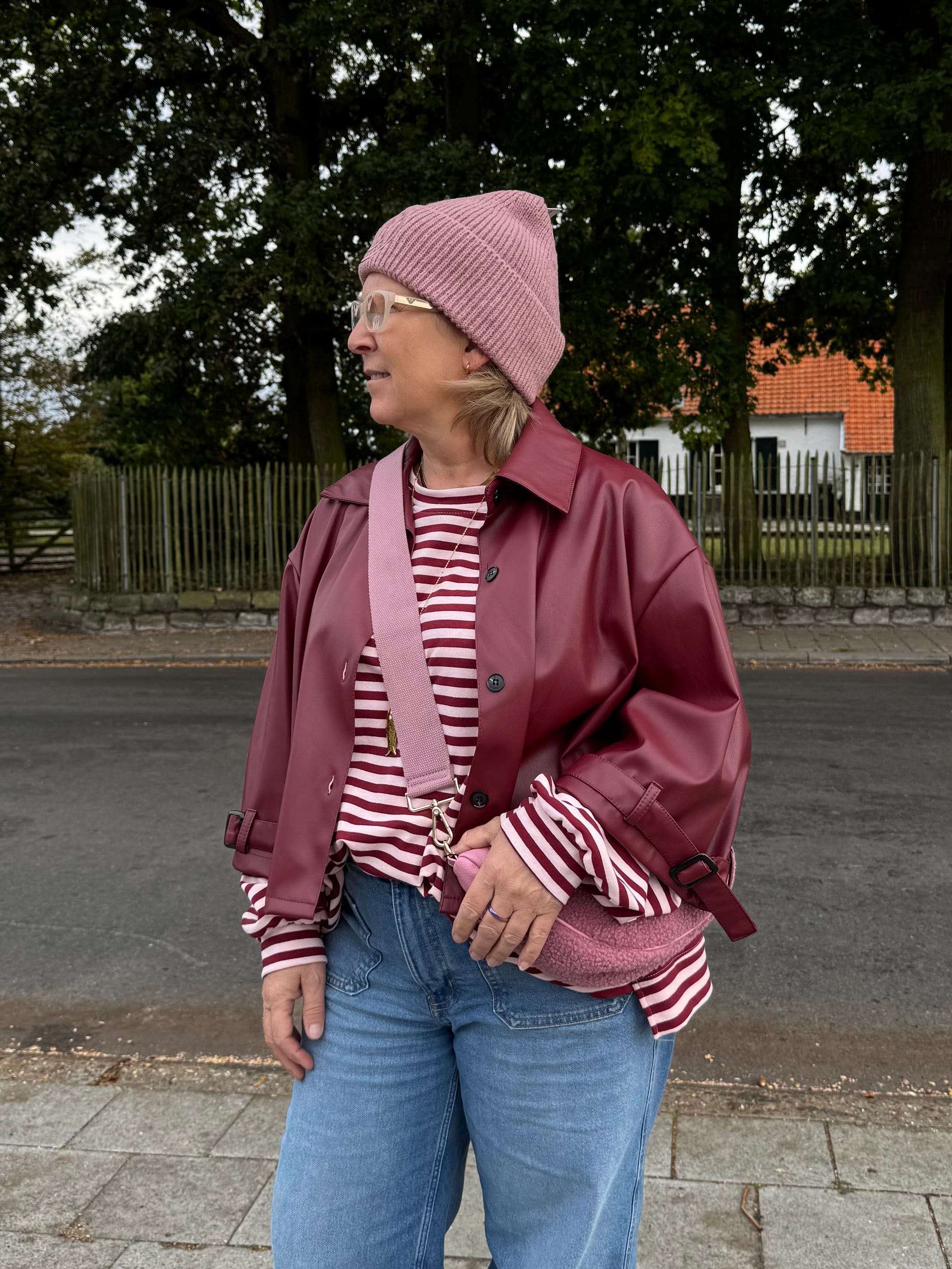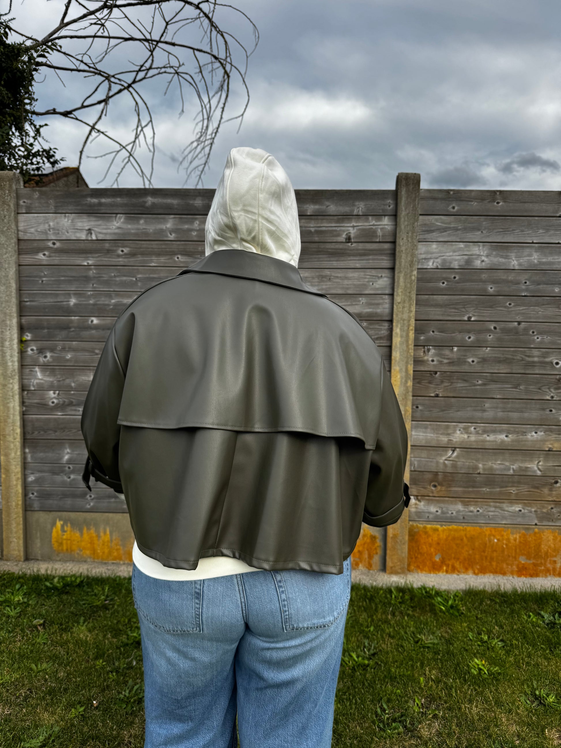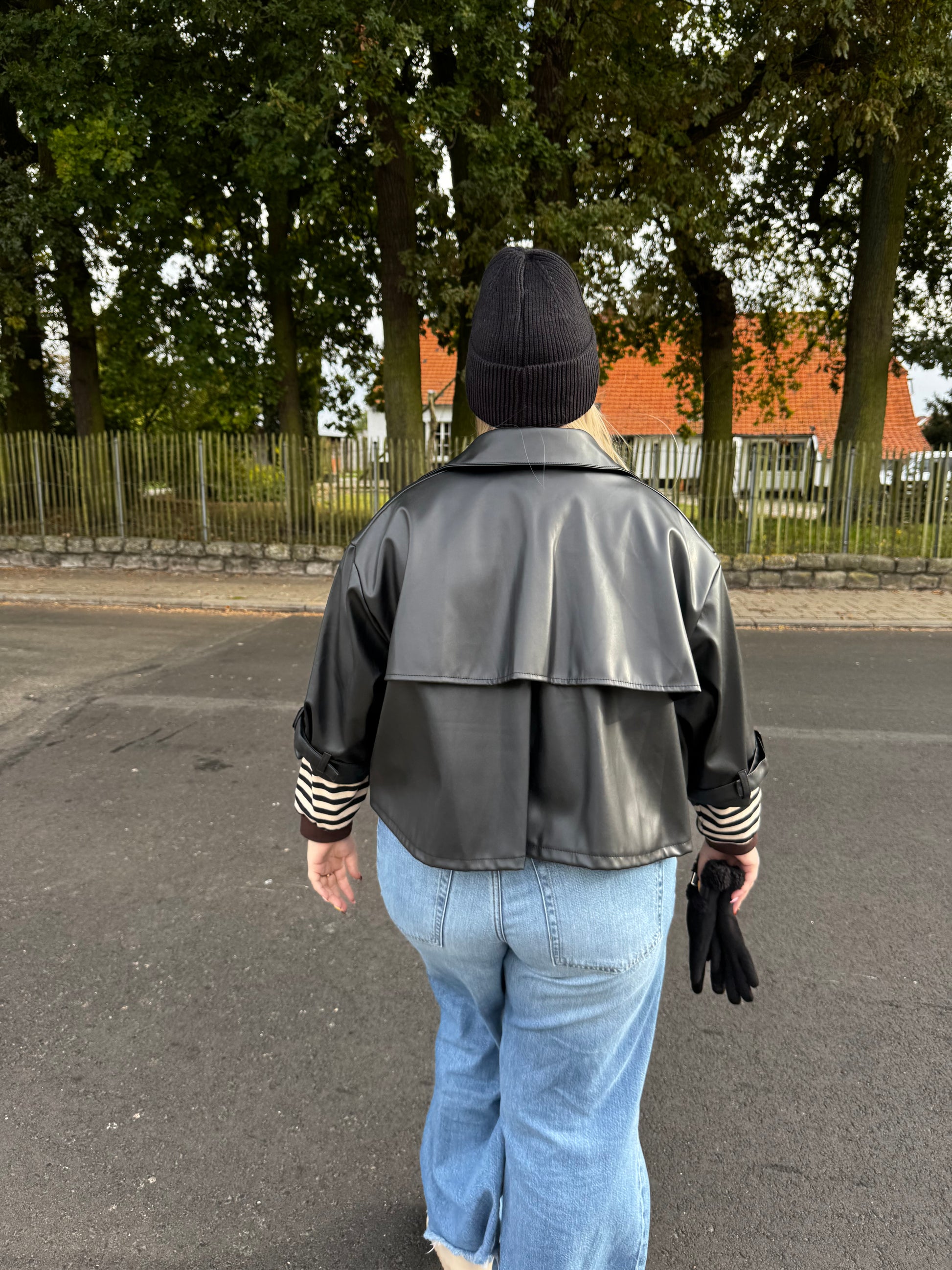 Deze korte jas met faux-leather look is een echte musthave! Dankzij de speelse, losse fit en de gespen aan de mouwen krijgt je outfit meteen een stoere touch. Perfect om te dragen over een hoodie of trui en super makkelijk te combineren met jeans of een jurkje. Verkrijgbaar in verschillende kleuren, zodat er altijd eentje bij jouw stijl past.