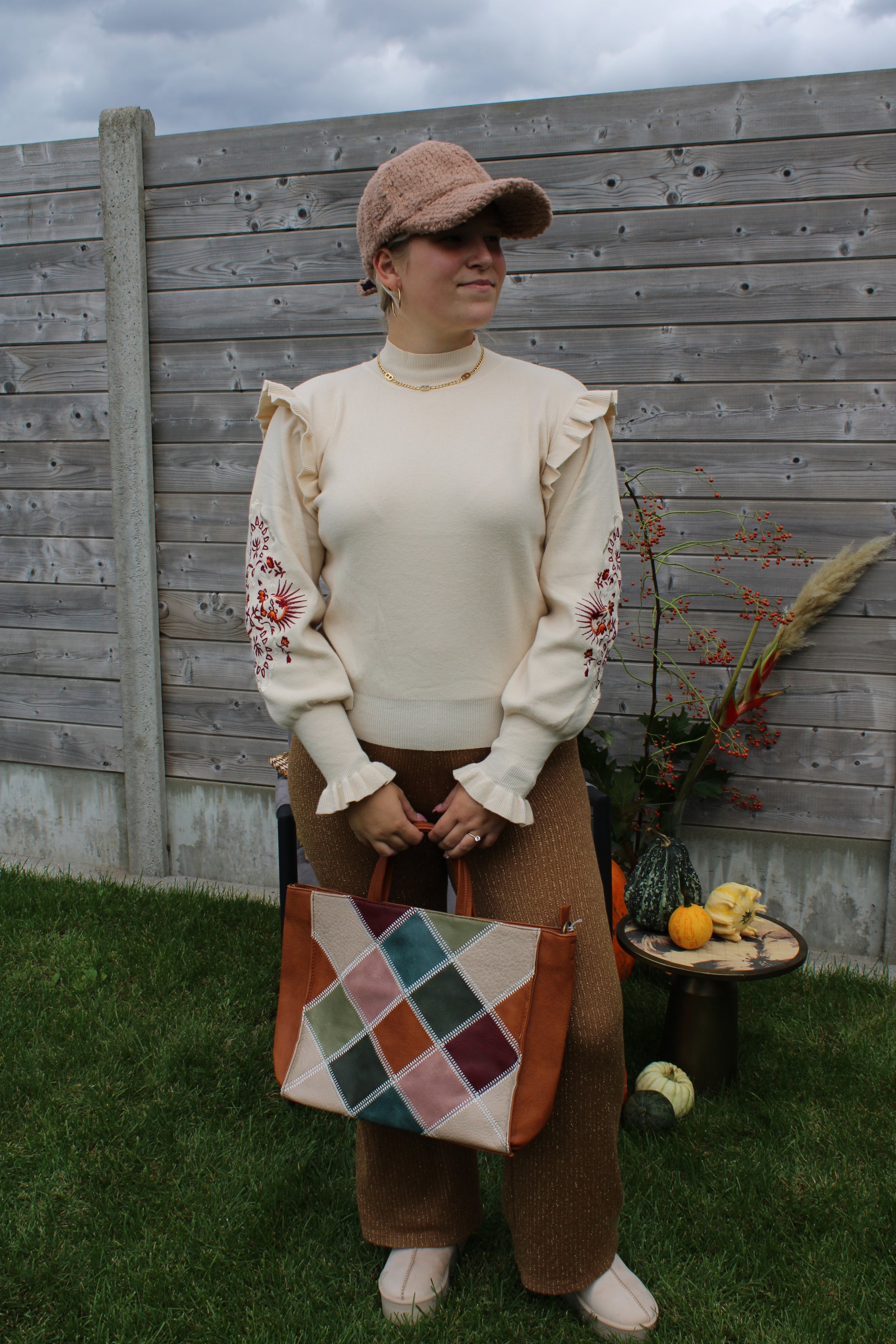 Luchtig elegant truitje met leuke twist aan schouders en polsen en tekening op de arm.